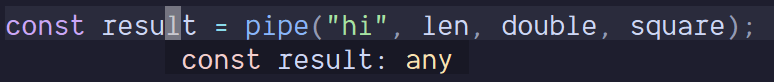 pipefunction is defined as a generic function that takes an initial value of any type and an arbitrary number of functions of theFntype. It then casts the return value of the function to the return type of the last function in the array.